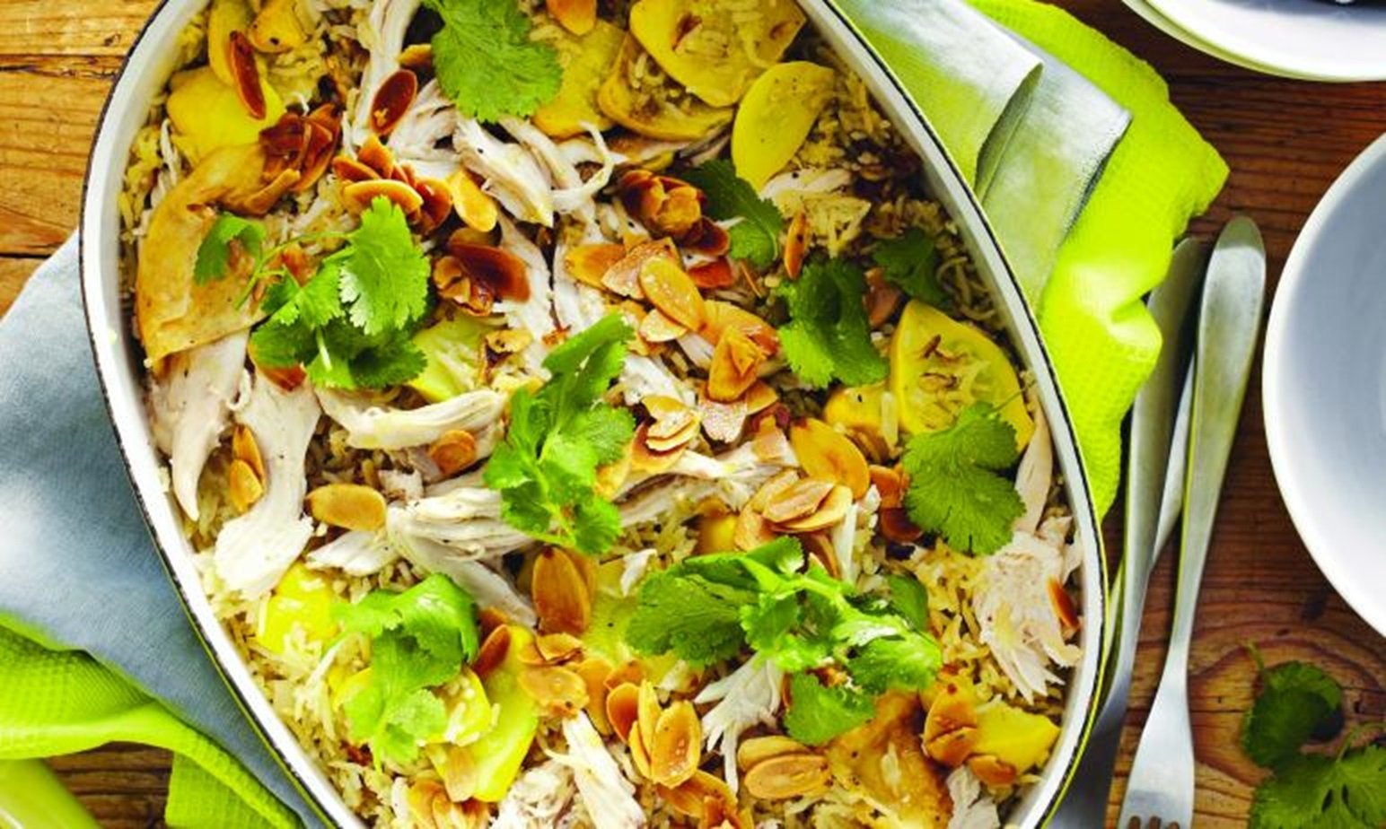 Flavor-filled chicken rice pilaf with zereshk berries from the cookbook Persian Fusion by Niloufer’s Kitchen, as part of Cooking Ethnic with Kids.