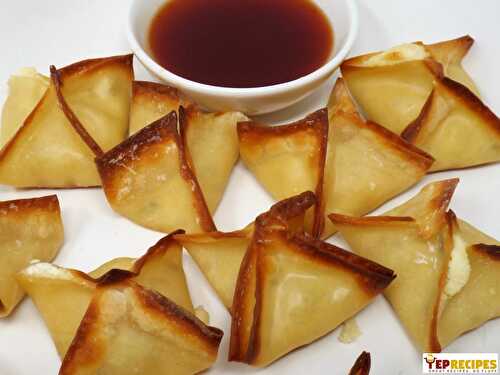 Oven baked wontons filled with cream cheese, green onions, and garlic and served with a honey sriracha dipping sauce.