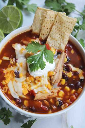 Warm, comforting and spicy crockpot turkey taco soup is perfect for using up leftover Thanksgiving turkey meat.