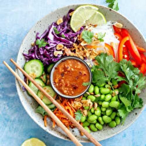 Fresh and delicious Rice Noodle Salad with tons of crunchy veggies and spicy peanut sauce.