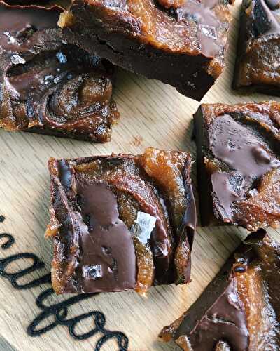 4-ingredient vegan dark chocolate fudge with salted caramel made from medjool dates.