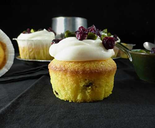 These festive gluten free saffron & cranberry cupcakes are topped with a rich vanilla cream cheese frosting and have a sprinkling of pistachios.