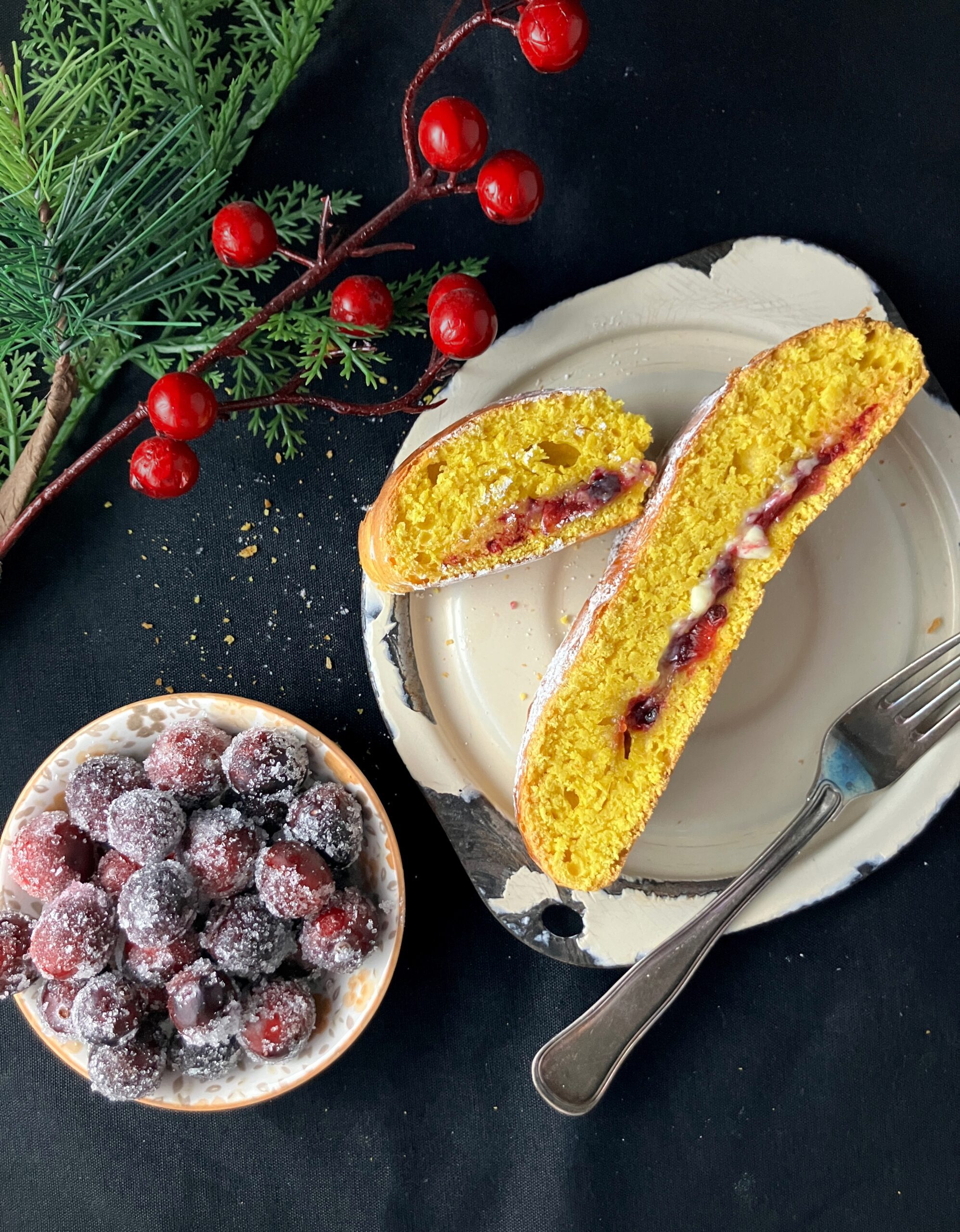 This babka bread is made with olive oil and a sweet/tart filling of white chocolate, saffron and goji berries.