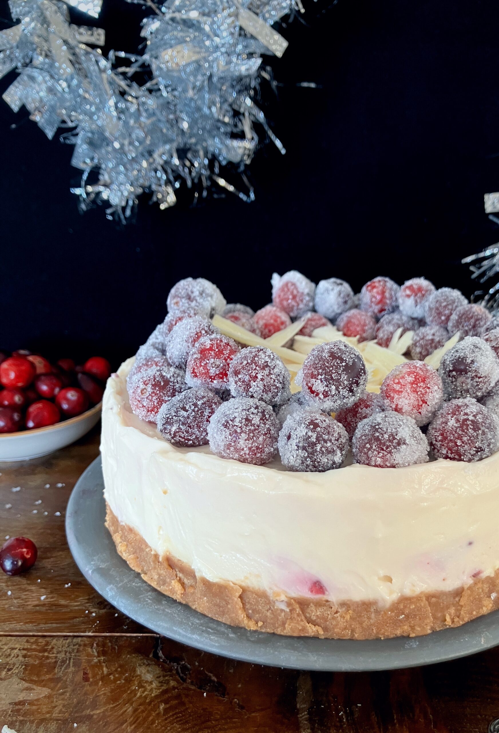This festive white chocolate truffle cheesecake has cranberries in the filling and a homemade ginger and oat crust to finish it off.