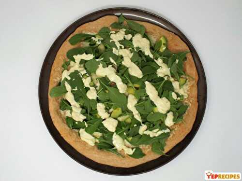 A homemade pizza crust made with a combination of bread and wheat flour topped with Monterey Jack cheese, sliced avocado, and baby arugula then drizzled with an aioli sauce.