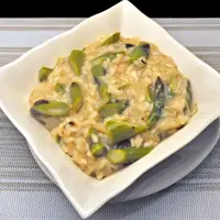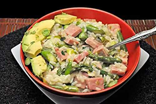 Spring Risotto with Ham and Asparagus, sliced Avocado to finish,