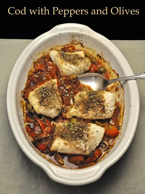 Baked Cod with a light, flavorful crust finished with Lemon, Olives and Capers
