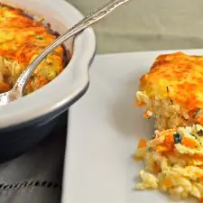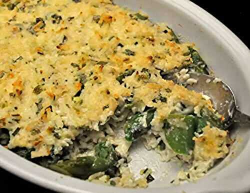 Onions and rice baked with Swiss cheese and topped with buttery breadcrumbs.