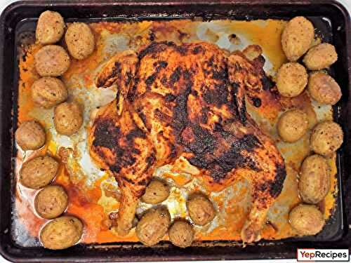 A sheet pan dinner consisting of a butterflied chicken rubbed in a paprika spice blend and roasted with seasoned baby potatoes.