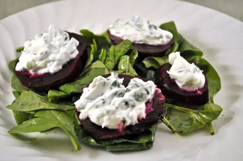 Fried goat cheese discs with roasted beet salad is simple and elegant.