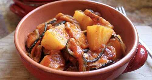 Dried zucchini, pancetta and potatoes in tomato sauce is a typical dish made by my family in the south of Italy.