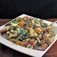 This creamy green bean potato salad is crunchy and full of flavour, packed with fresh vegetables, and lightly coated in a tasty garlic mayonnaise dressing.