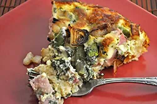 Easy Quiche with Ham, Broccoli, Leeks and Peppers, in a shredded potato crust.