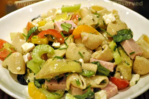 Penne pasta, artichoke hearts, cucumber, kalamata olives, pepeproncinis, red onion, and feta cheese tossed with oil, vinegar, and herbs then served chilled.