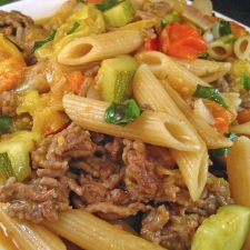 Pasta with Ground Beef, Zucchini and Cherry Tomatoes