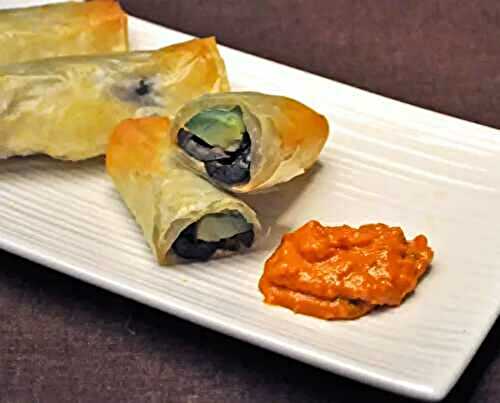 Olive and Avocado Egg Rolls, Greek style with feta and endive.