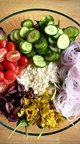 What makes this Greek Salad extra special? The garlicky, lemony dressing, the crunchy veggies, the delicately shaved red onion, the tangy punches of kalmatas and pepperoncinis, and the crumbles of creamy feta cheese.