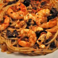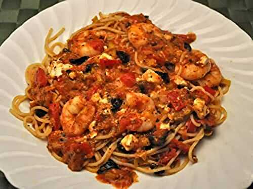 Spaghetti with Shrimp, Feta and Greek Olives, a quick pasta dish with the flavors of the Mediterranean.