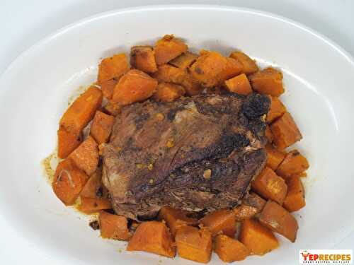 Pork shoulder and sweet potatoes slow cooked in apple cider vinegar.