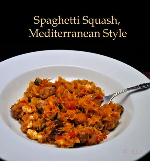 Spaghetti Squash, Mediterranean Style, with Sausage, Greek Olives and Feta Cheese