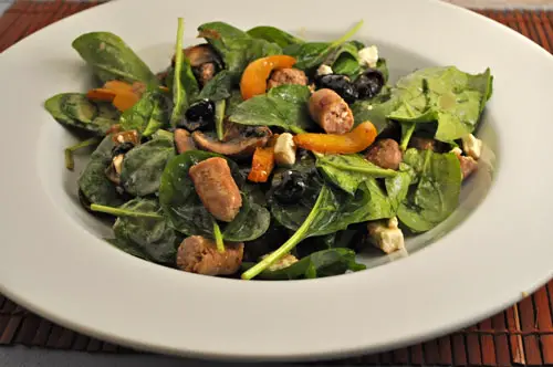 It's salad season: Spinach Salad with Sausages, Peppers and Feta.