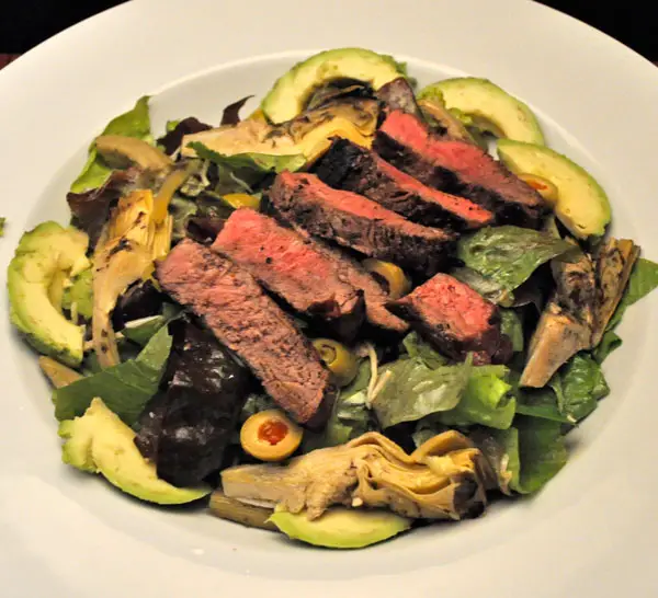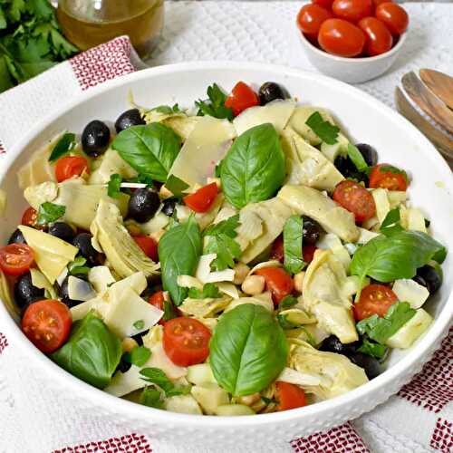 Penne pasta, artichoke hearts, cucumber, kalamata olives, pepeproncinis, red onion, and feta cheese tossed with oil, vinegar, and herbs then served chilled.