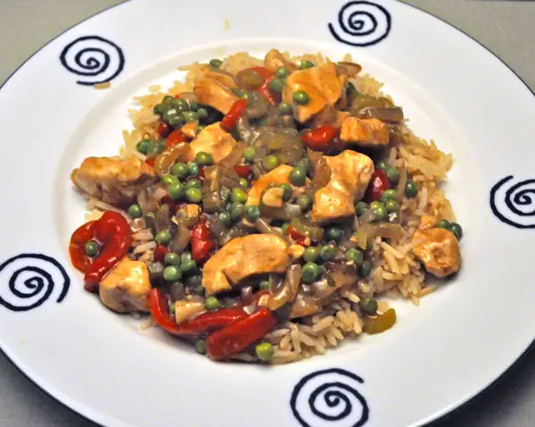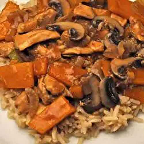 Marinated chicken breast stir-fried with mushrooms, garlic, ginger, and green onion then served over steamed rice.