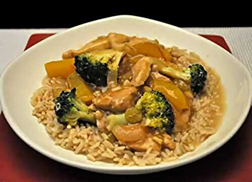 Stir-Fried Chicken with Broccoli and Peppers, served over quick-cooking brown Basmati.