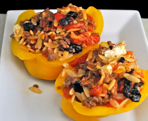 Golden Acorn Squash Stuffed with Spicy Beef, Peppers, Mushrooms and Onions