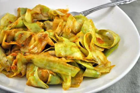 Quickly stir-fried in a skillet these spiralized zucchini noodles are made with purchased pesto for a quick summer side dish.