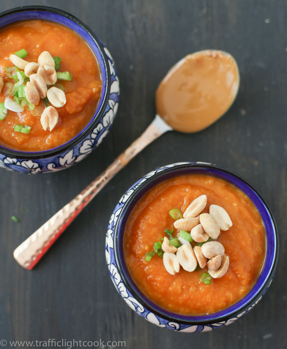 This African peanut stew is vegan with carrots, sweet potatoes, bell pepper, spinach and of course peanuts.