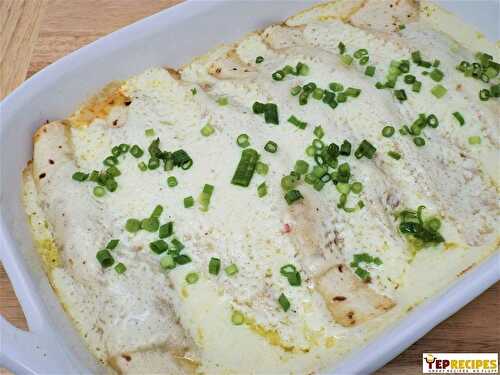 Vegetarian enchiladas filled with corn, zucchini, red onion, and Pepper jack cheese then topped with a white enchilada sauce.
