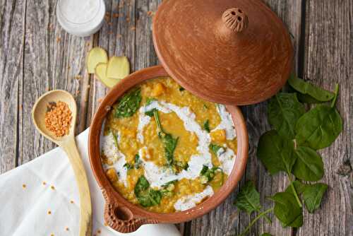 Pittige rode linzen tajine met zoete pompoen, spinazie, gember en kokosmelk.