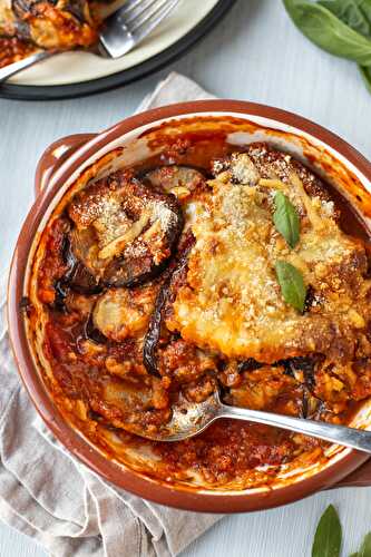 This cheesy eggplant bake is a really easy and non-fiddly version of a classic eggplant parmesan, with roasted aubergines, rich tomato sauce, and gooey cheese.