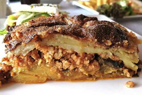 Moussaka with potatoes and eggplant includes ground beef or lamb, cheese, béchamel sauce, and tomatoes, for an authentic and delicious flavor
