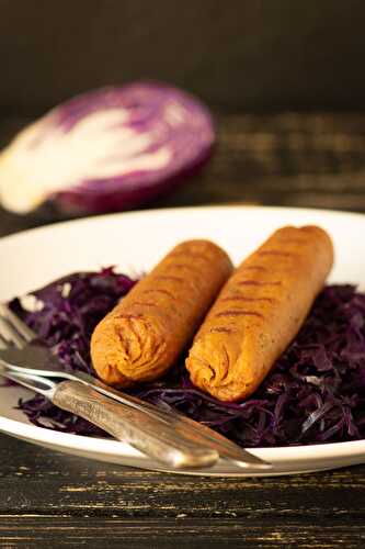 Vegan seitan beer sausages with sweet and tangy braised purple cabbage.