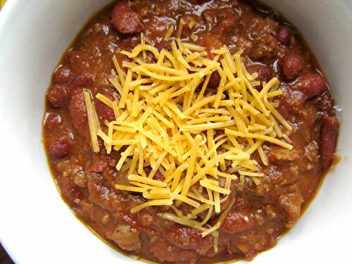 Inspired by Zippy's Hawaiian chili: A slow cooker beef chili made with homemade Portuguese sausage, kidney beans, pinto beans, tomatoes, spices, and just a touch of mayonnaise.