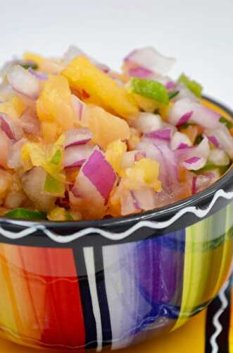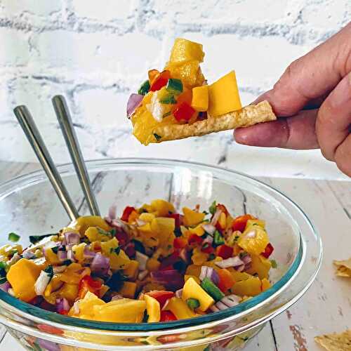 Sweet and tropical pineapple mango salsa tastes like summer! Made in five minutes, this 7 ingredient fruit salsa is addictive! Serve with chips, chicken or at any celebration, it will always bring the WOW factor!