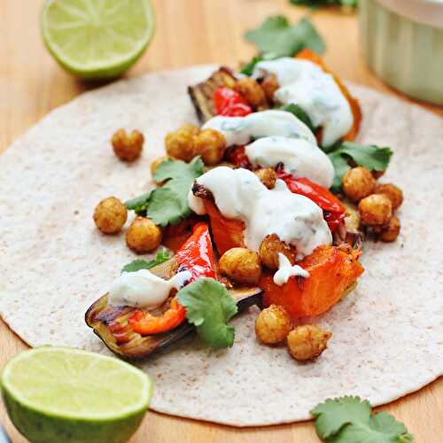 Spiced roasted chickpea tacos with with roasted vegetables make a healthy nutritious meal.