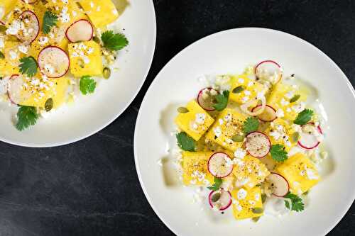 A twist on the classic feta and watermelon salad using yellow watermelon with chipotle powder, radish, queso fresco, cilantro and pepitas.