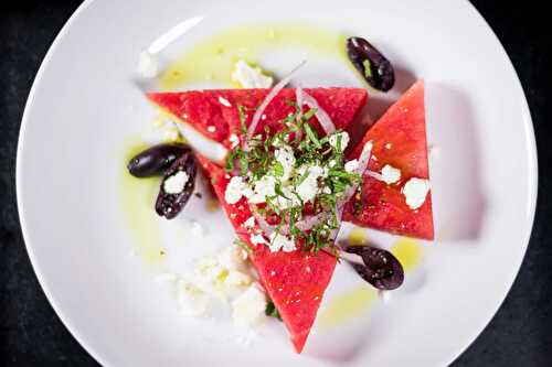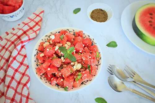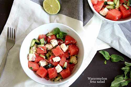 Crisp, cold watermelon tossed with tangy feta and fresh mint is the perfect summertime salad to have on a hot day.
