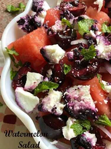 A fantastic salad made with watermelon, red onion, sweet cherries, blueberry vanilla goat cheese and fresh mint.