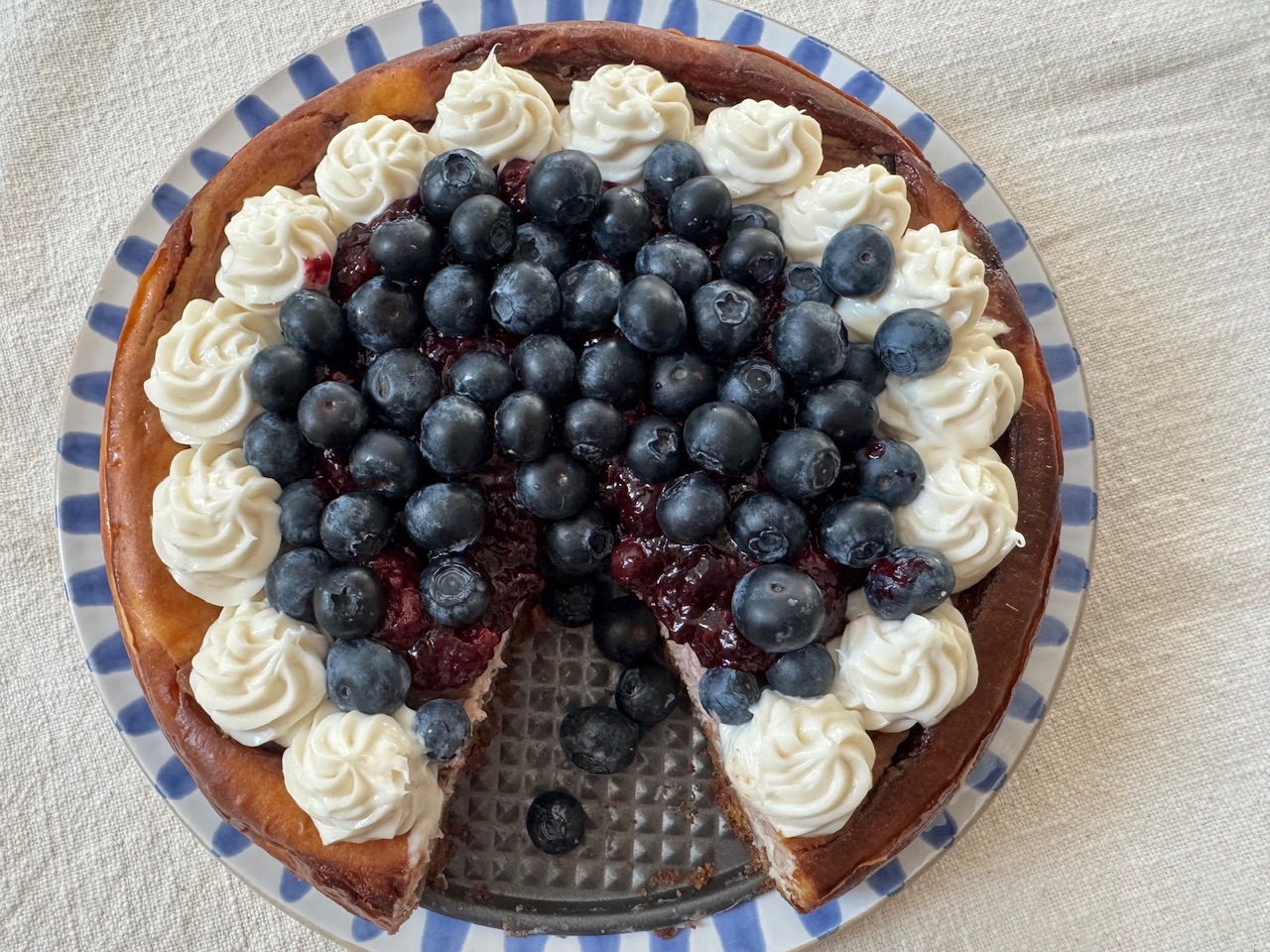 This baked Greek yoghurt cheesecake is smothered with a fresh, tangy blueberry compote and has no refined sugar.