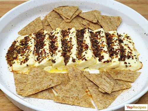 Greek feta cheese brushed with oil, garlic, oregano, and red pepper flakes then baked until soft and warm.