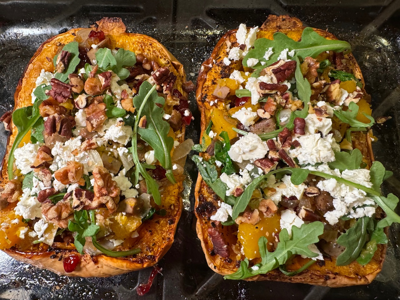 Sweet roasted butternut squash is stuffed with a pre-cooked Mediterranean filling inspired by the traditional Greek Spanakorizo aka Spinach and Rice.
