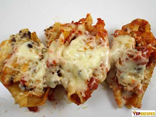Baked pasta shells overstuffed with mushrooms and ricotta cheese.