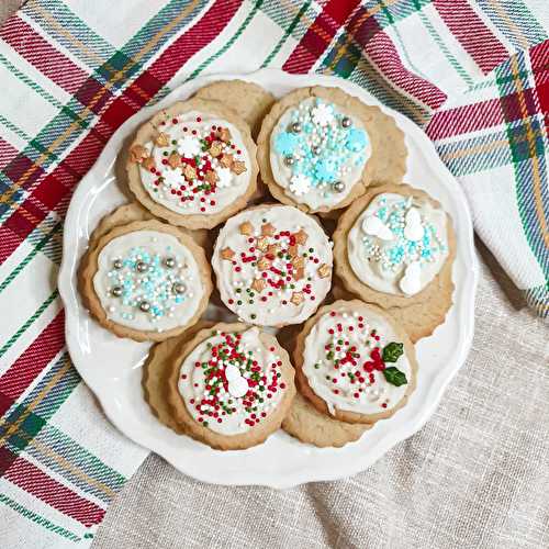 Quick and easy, these Christmas sugar cookies are a fun baking treat for the family decorated them with frosting, and festive sprinkles!