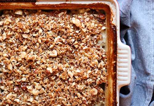 Savory root vegetable gratin with a garlic and herb infused cream and a roasted hazelnut and parmesan breadcrumb topping!