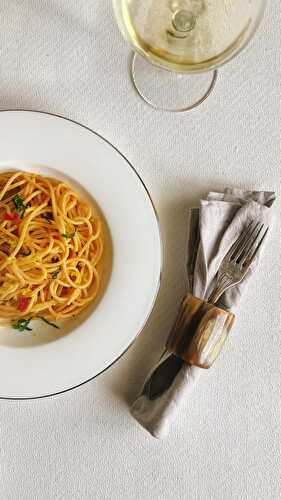 Spaghetti made with anchovies, olive oil with a hint of garlic, just enough chili to tease, finished with a sprinkle of refreshing lemon zest to balance it all.