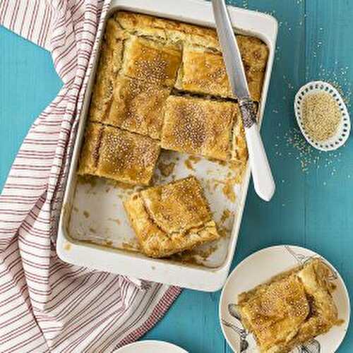 This savory cheese pie is made with puff pastry and filled with four different types of cheese and a black tea and cinnamon scented béchamel sauce.